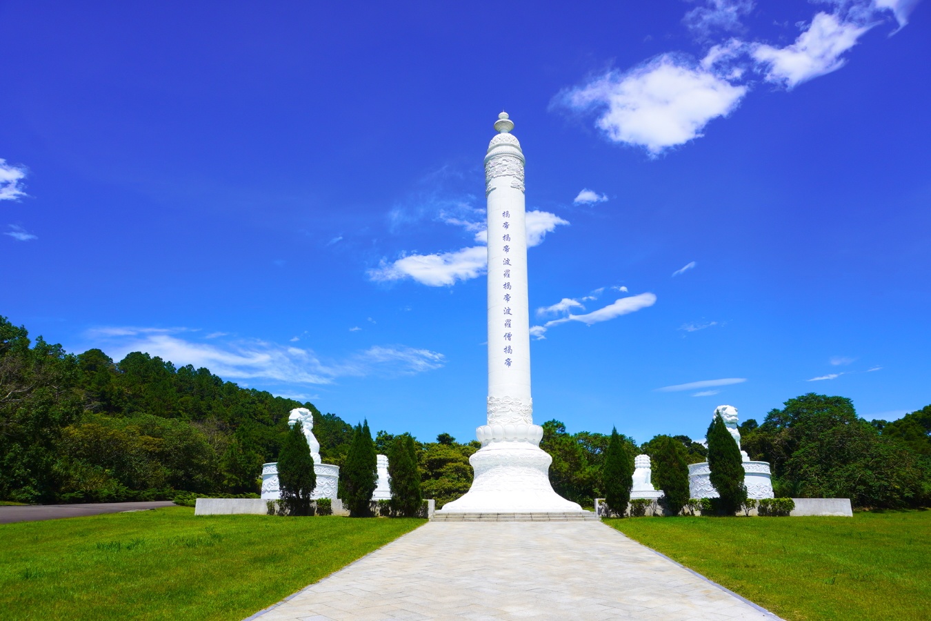 漢白玉心經柱高高聳立在園區的中心,從園區的每個角落都能夠清楚看見。上面刻著心經的咒語「揭諦!揭諦!波羅揭諦!波羅僧揭諦!」譯為白話文即為「走吧!走吧!去彼岸吧!一起去彼岸吧!」。
